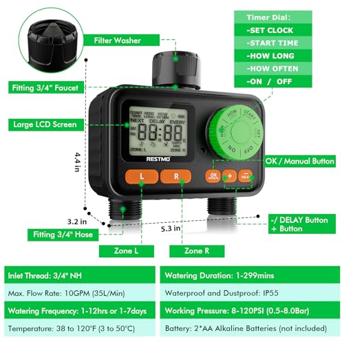 Specifications: Built to withstand the elements, this timer boasts IP55 waterproof protection and a leakproof construction, making it ideal for outdoor use. Compatible with 3/4” hoses and faucets, it works with water pressure from 8-120 psi and is powered by 2*AA batteries (not included) for over 1 year of reliable operation.