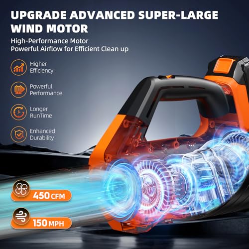 ?Advanced Powerful Motor Technology?Our Leaf Blower Cordless adopts advanced turbo technology and axial fan design to maximize airflow output.It delivers an impressive air volume of up to 450CFM of air volume and 150 MPH with the tapered nozzle,ensuring the Leaf Blower Cordless is highly effective for clearing large piles of leaves and debris.Our battery leaf blower can be assembled in minutes,It can quickly blow away lightweight objects such as leaves and dust, making your cleaning work easier.