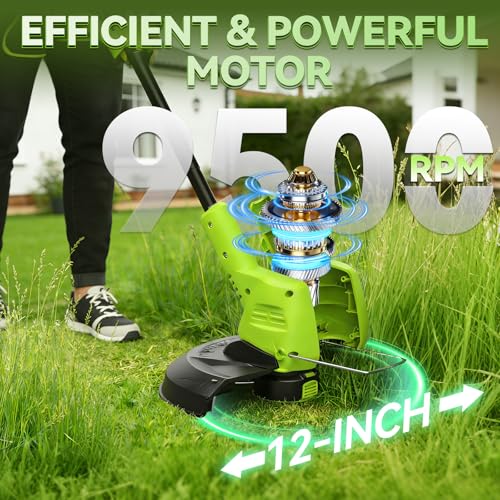 ?Powerful & Quiet 9500RPM Motor?Experience the perfect balance of power and quiet operation with this electric weed wacker. Our weed eater battery powered motor delivers 9500RPM high torque to slice through thick weeds and overgrown lawns effortlessly. With a 12?inch cutting width and 0.065?inch durable trimming line, this cordless weed wacker cuts efficiently without line breakage—solving the "weak line" issue. Advanced heat dissipation prevents overheating, ensuring long sessions.