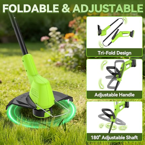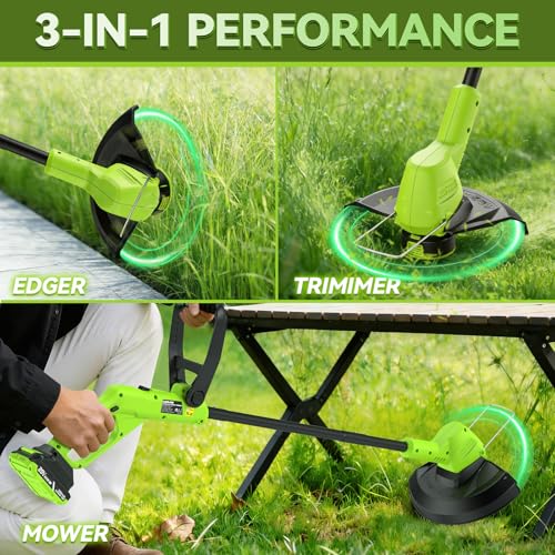 ?3?in?1 Adjustability?Weighs just 3.5 lbs—far lighter than gas models. This versatile trimmer lawn tool converts to a precision edger with a 180° folding shaft. Rubber-coated handle reduces fatigue; switch between trimmer, edger, and mower modes effortlessly. Whether you need a lawn edgers battery powered for borders or a grass edger for beds, this cordless weed eater adapts instantly. Tool?free assembly gets you started in minutes.