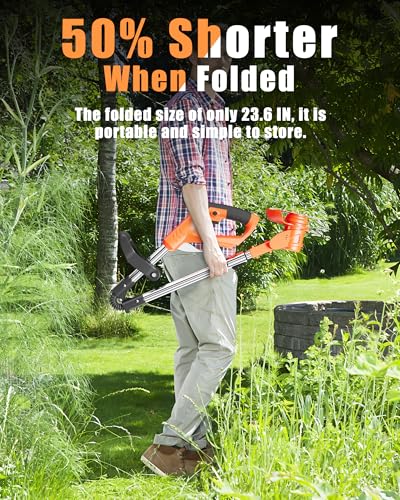 Lightweight, Foldable and Adjustable Length: The cordless weed eater weighs only 4.4 pounds. Adjustable height and handle (maximum length 52.3 inches) improve comfort and can be easily used by women and the elderly, making it suitable for different groups. Low noise design, have fun during the trimming process. The foldable design makes storage easier and more convenient to carry whether at home or in the car when going out