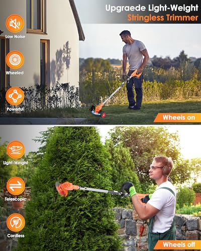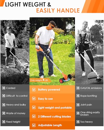 3 IN 1 Electric Weed Wacker: Upgraded weed wacker combines a cordless lawn mower, weed trimmer, and edger lawn tool in one. It can also easily convert from a grass trimmer to a wheeled weed wacker cordless . Unrestricted by power cords, it can be used anywhere and is perfect for trimming yards, shrubs, flower beds, roadside areas, and around the yard, making your lawn the envy of the neighborhood