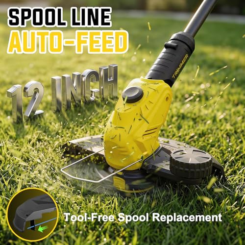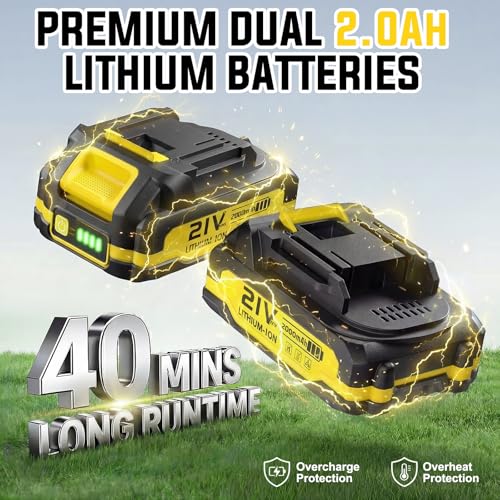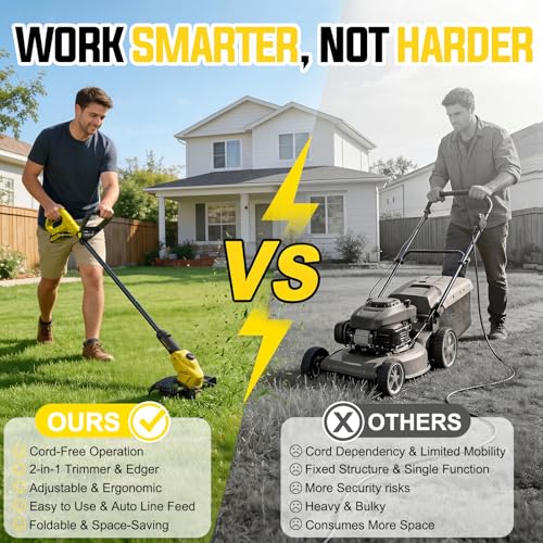?Exceptional Cutting Performance?This weed eater equips with two 21V 2.0Ah lithium batteries, delivering up to 40 minutes of runtime. Powerful cutting force combined with a wider safety guard ensures operator safety while protecting flowers, effortlessly tackling dense grass and stubborn weeds. Compared to traditional mowers, it trims hedges, sidewalks, and flower bed edges with greater precision