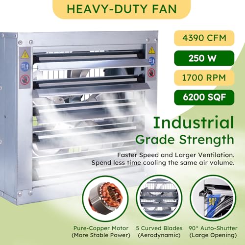 ????CUSTOMER SUPPORT: FarmLuLu exhaust fans offer 1 year warranty.30-day return policy,even if bumped or deformed.Feel free to ask us if you have questions.4700 CFM,1700 RPM,5 blades,250W,1/3 HP,120V,60Hz,2.1A,6200 SQF, 1 speed controller.
