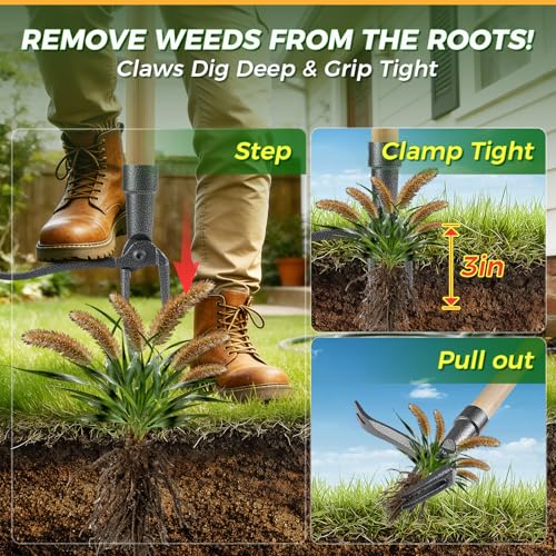 ?Stand Up Weed Puller?: When using our heavy-duty stand-up weeding tool, simply stand upright, position the weeder directly over the weed, and press down on the foot pedal to firmly drive the claws into the ground. This will help the weeder grasp the roots of the weed, allowing you to easily pull it out by the roots and prevent regrowth. Note: After pulling the weed, step on the foot pedal and the weed will automatically drop off. It’s perfect for use in gardens, lawns, or yards.