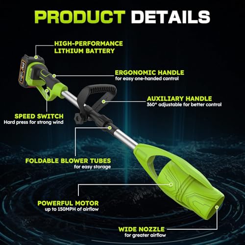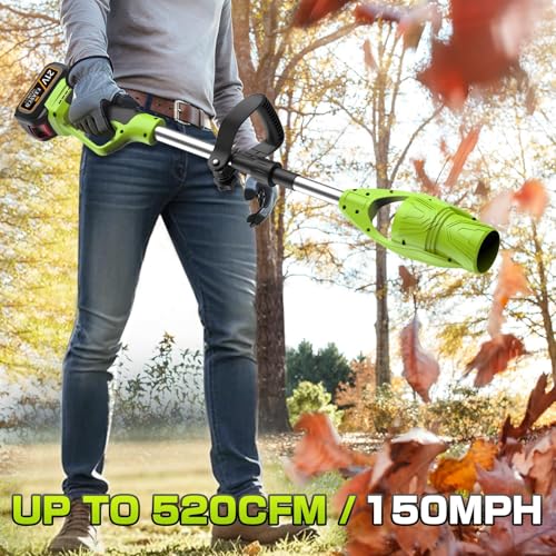 High Power Performance --- Our leaf blowers for lawn care feature a copper motor that offer a longer lifespan and reduced energy consumption compared to standard motors. Additionally, the cordless leaf blower utilizes turbocharging technology to achieve a maximum air volume of 150MPH/520CFM, making it effortless to clear outdoor debris like snow and fallen leaves
