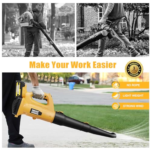 ?Portable & Simple to Use?Our compact cordless leaf blower is designed to be lightweight, allowing for effortless operation with a single hand. Weighing in at just 6.5 lbs, it is perfectly manageable for individuals of all ages, including older adults, to effectively clear their entire yard of leaves. Simply press the on/off switch and trigger lock simultaneously to activate the blower