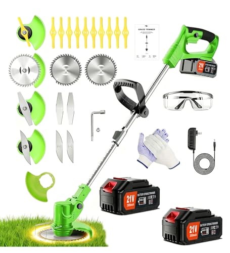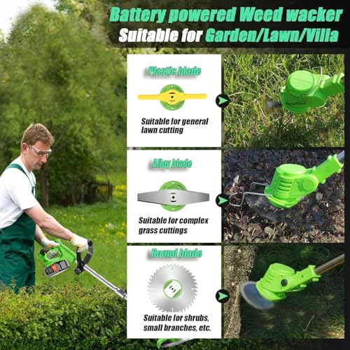 4 Interchangeable Blades:This cordless weed wacker comes with four dedicated blades to handle a wide range of lawn and garden mowing tasks.The plastic blades are ideal for trimming fine grass and delicate weeds around flower beds and vegetable gardens without damaging plants; the round metal blades easily cut thick weeds up to 0.5 inches in diameter; the alloy blades handle thick shrubs and; and the S-shaped blades provide a clean and crisp trim for large lawns.Yard maintenance must haves.
